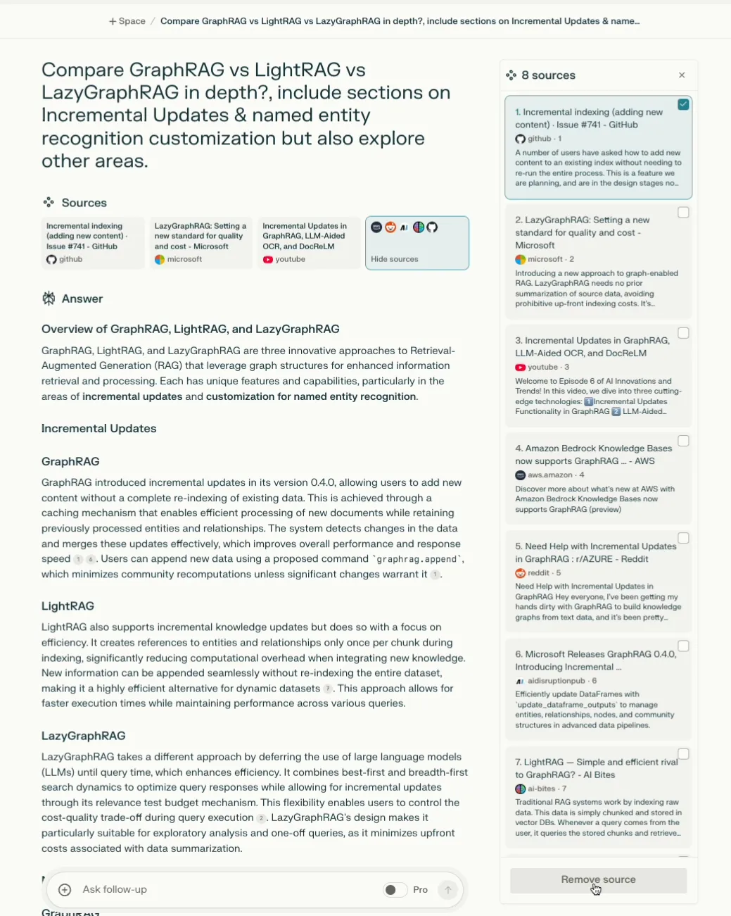 Another useful tool for research is Perplexity, which provides a detailed view of augmented research and summaries. Notable differences include broader resources and configurations offered by Perplexity, which include YouTube sources and the ability to remove sources that you deem irrelevant, a very useful feature since bad data can affect the outcome.