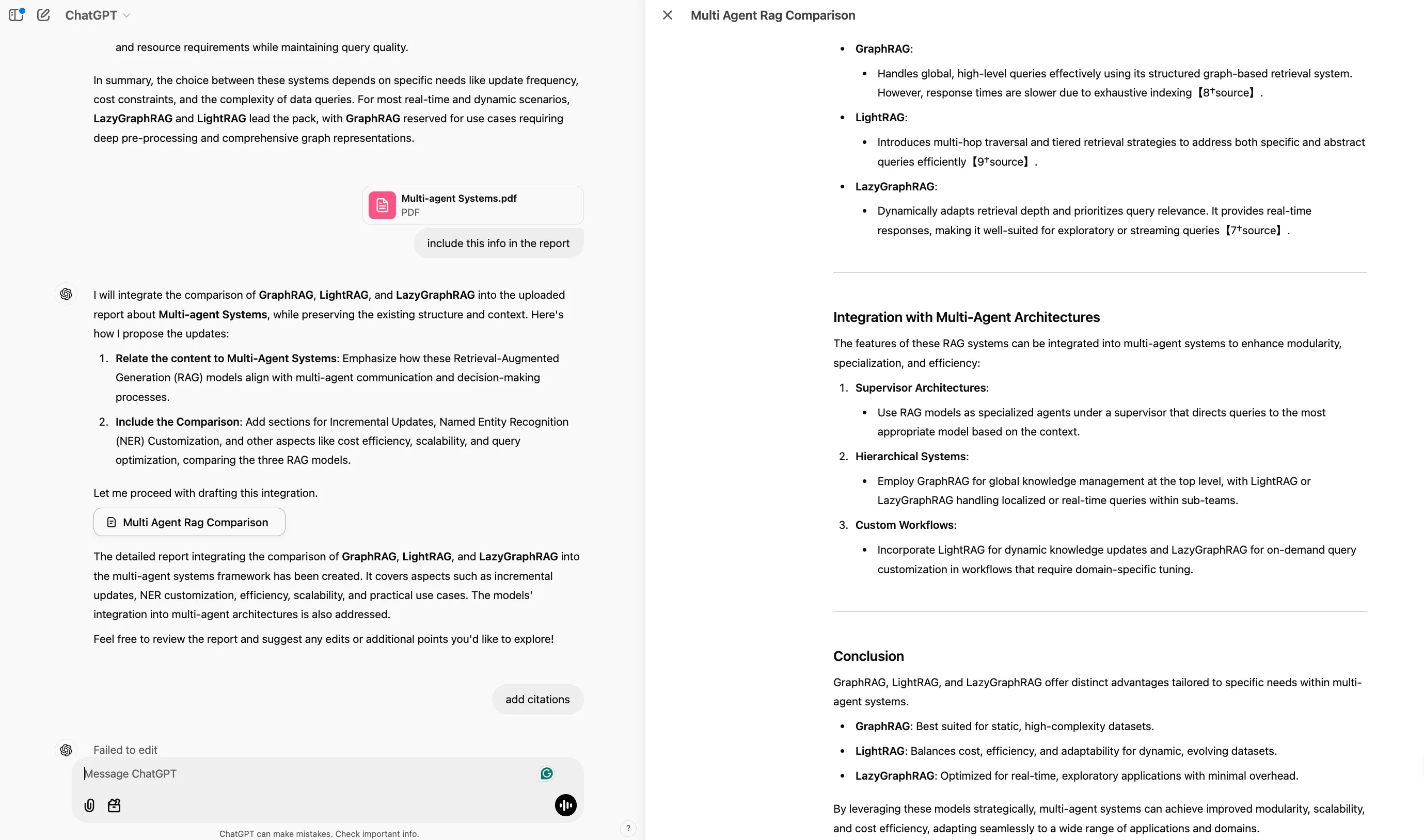 You can start to build upon the report and augment the earlier research with custom documents by uploading them. It can then reference the material either via the previous search or the uploaded documents. I did not prompt it to maintain the same report format, so it changed, which is a bit annoying, and the references are not correctly cited in the new report. With some prompt engineering, I could tweak the report to achieve the output format I prefer.