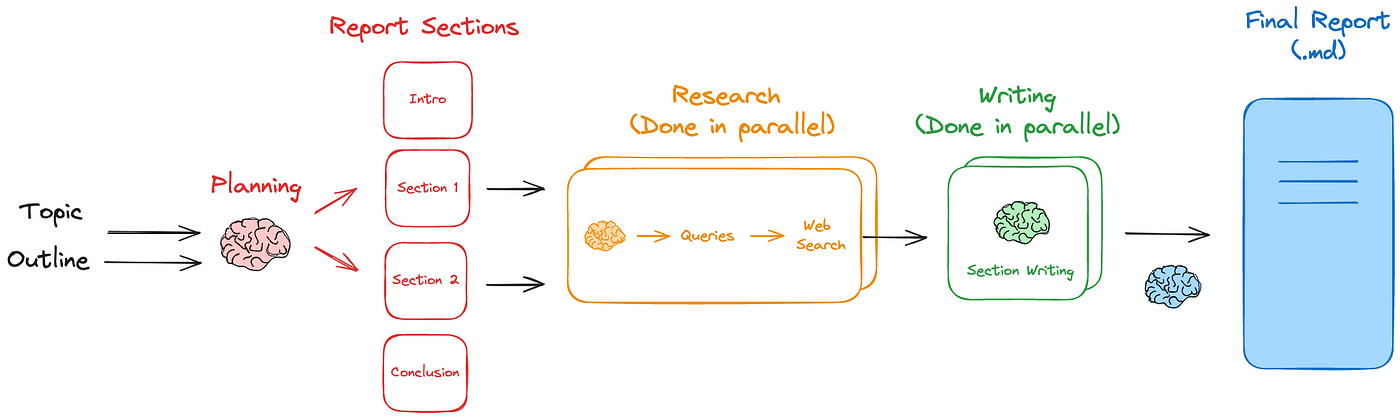 - Each section conducts in depth research via a web search or RAG search.